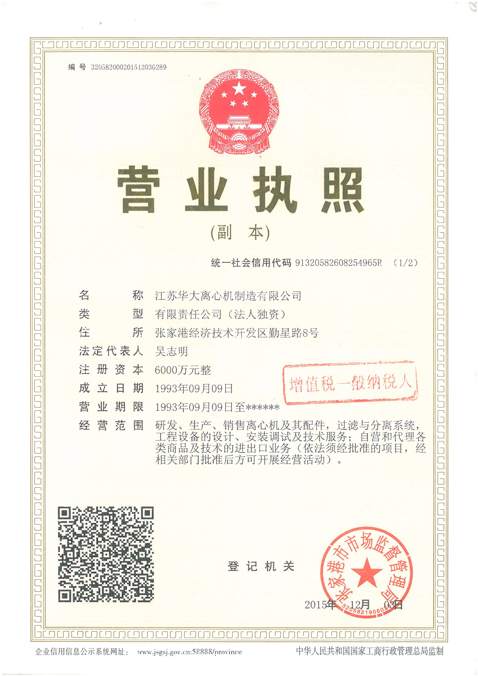 江苏华大是中国分离机械标准化技术委员会委员单位、中国通用机械协会分离机械分会副理事长单位、分离心机国家和行业标准起草单位、江苏省高新技术企业、国家火炬计划重点高新技术企业。1998年即获得离心机国家安全认证。江苏华大是国内过滤与分离机械行业规模最大、产品品种与系列最齐全、最具竞争力和影响力的企业之一。