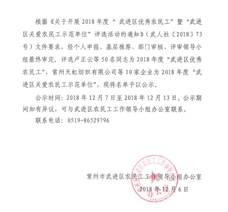 2018年度“武进区优秀农民工”及“武进区关爱农民工示范单位”名单公示公告
